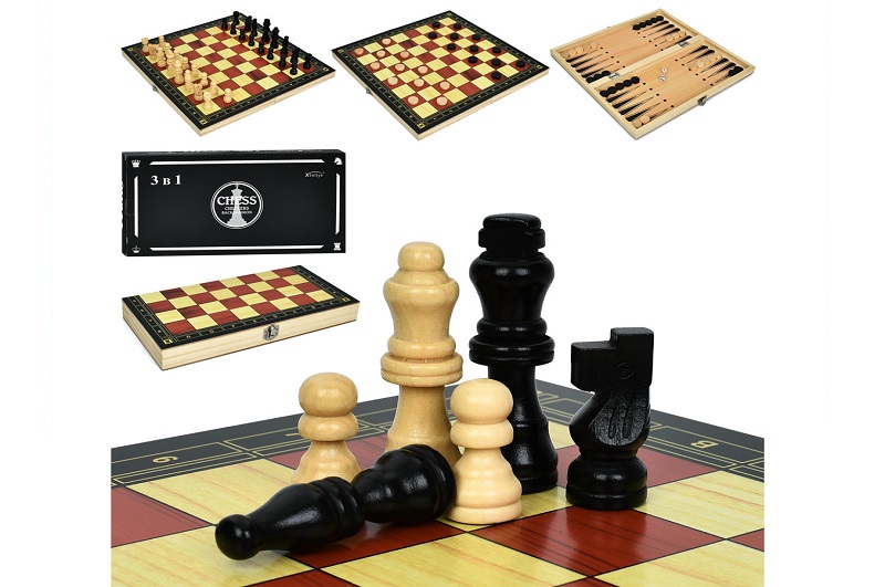 Шахи A0054 (24шт) дерев'яні, 34-34, 3в1(нарди, шашки), фігури дерев'яні, в кор-ці, 34,5-17,5-4см