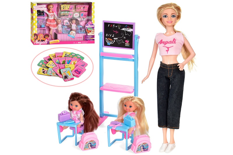 Лялька 100-1 (18шт) 30см, 2 дітей-12см, школа, парти, мольберт, картки, 2види, в кор-ці, 46-33,5-8см