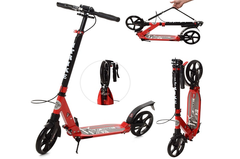Самокат SR 2-018-9-R (1шт) доросл.,алюм.,кол.2шт.ПУ200мм.,кермо77-100см,ручне гальмо,замок,червоний,