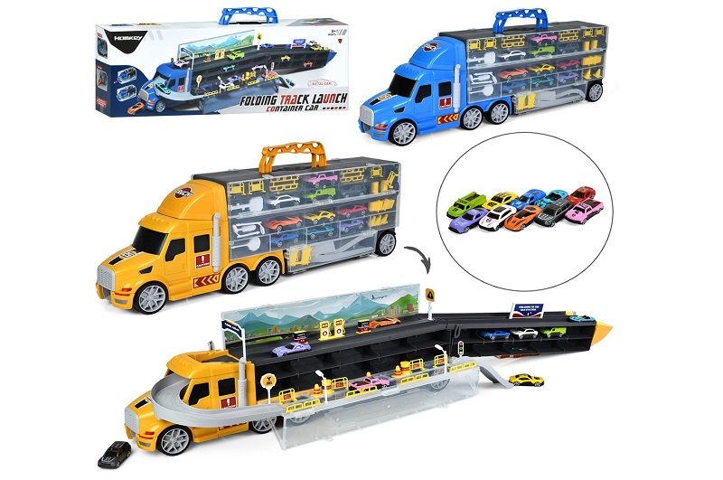 Трейлер 8803A (8шт) 62см, 3в1(трек, гараж), машинка 10шт(метал), дорожні знаки, 2 кольори, в кор-ці,
