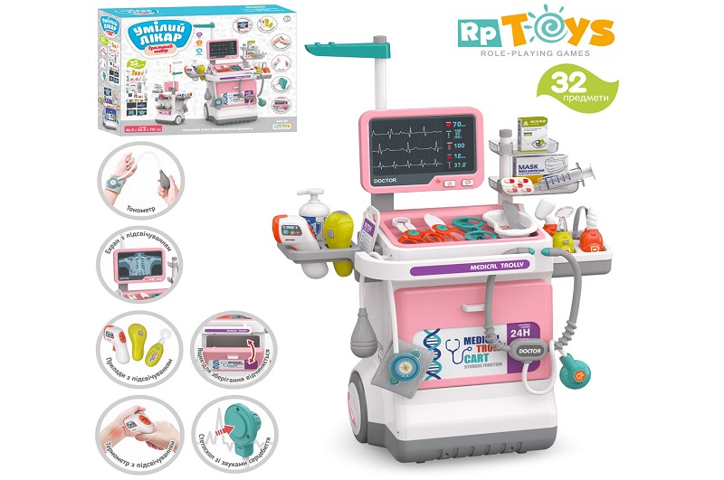 Набір лікаря 660-94 (12шт) стіл-возик, 46,5-26,5-в115см, рентген, стетоскоп, мед.інструменти, звук,