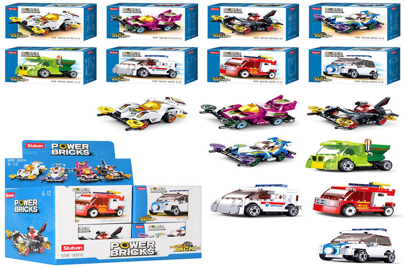 Конструктор SLUBAN M38-B0916 (144шт) транспорт, від 49дет,в кор-ці,16шт(8видів)в дисплеї,29-20-19см