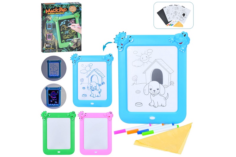 LCD планшет D4238 (60шт) для малювання,21-25,5см, світ.в темряві,4неон.фломастери,серветка,8трафар.,