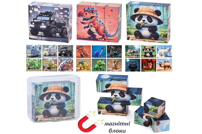 Гра CL325-1-2-3 (72шт) кубики-пазли, 9шт, магнитні, 3 види (тварини, транспорт, динозаври/дракони),