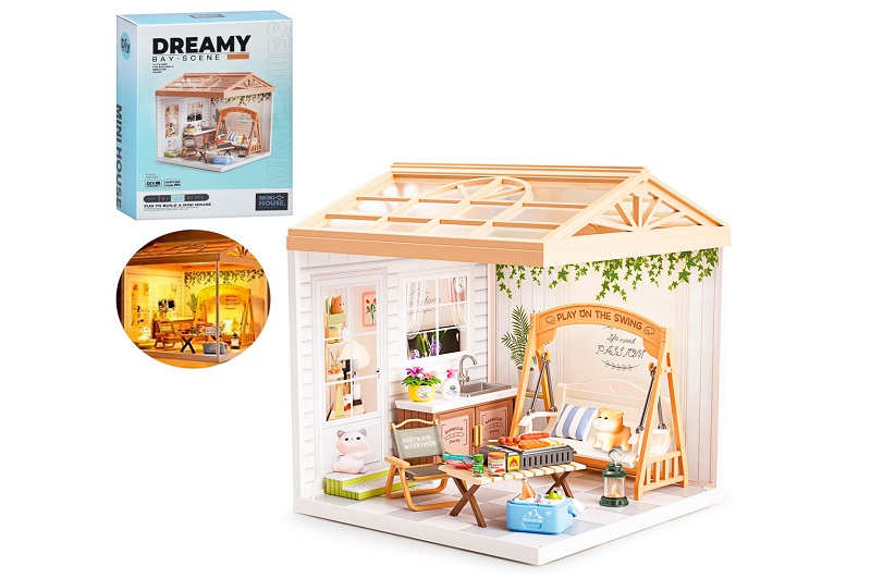 1,231.14 грнБудиночок 8010 (9шт) Зроби сам, веранда, гойдалка, стіл, мийка, аксесуари, світло, від мережі/USBшну